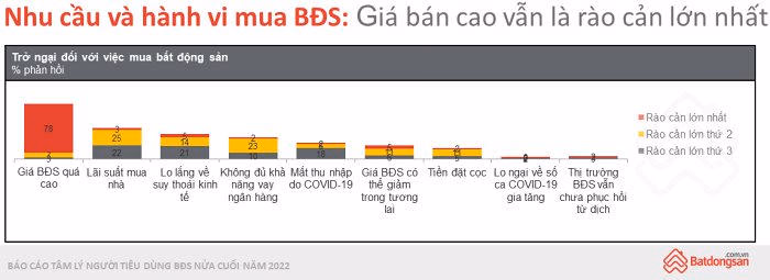 Trong khi đó, đến 70% số người được hỏi không có kế hoạch mua hay thuê bất động sản nào trong năm tới. Rào cản lớn nhất đối với việc mua bất động sản là giá bất động sản cao, tiếp đó là những khó khăn liên quan đến vay mua nhà như lãi suất vay cao và người muốn mua nhà không đủ khả năng để vay từ ngân hàng.