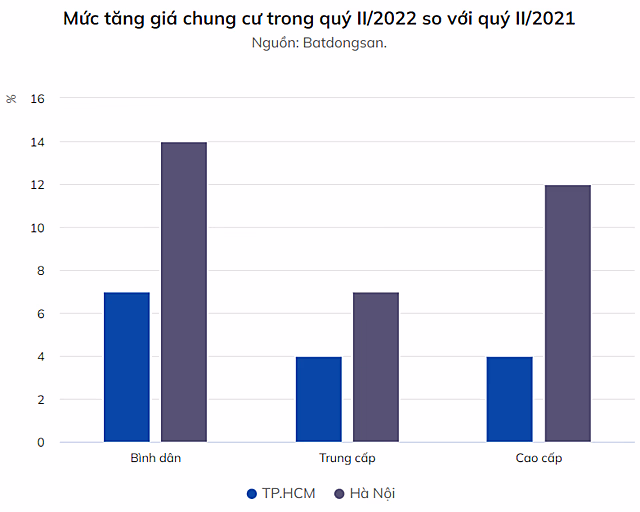 Nhìn chung toàn thị trường, chuyên trang Batdongsan cho biết trong quý II vừa qua, chung cư ở TP HCM chỉ tăng giá 4% ở phân khúc cao cấp, trung cấp và 7% ở phân khúc bình dân so với năm 2021. Còn ở Hà Nội, phân khúc bình dân tăng giá đến 14%, trung cấp tăng giá 7% và cao cấp tăng giá 12%.