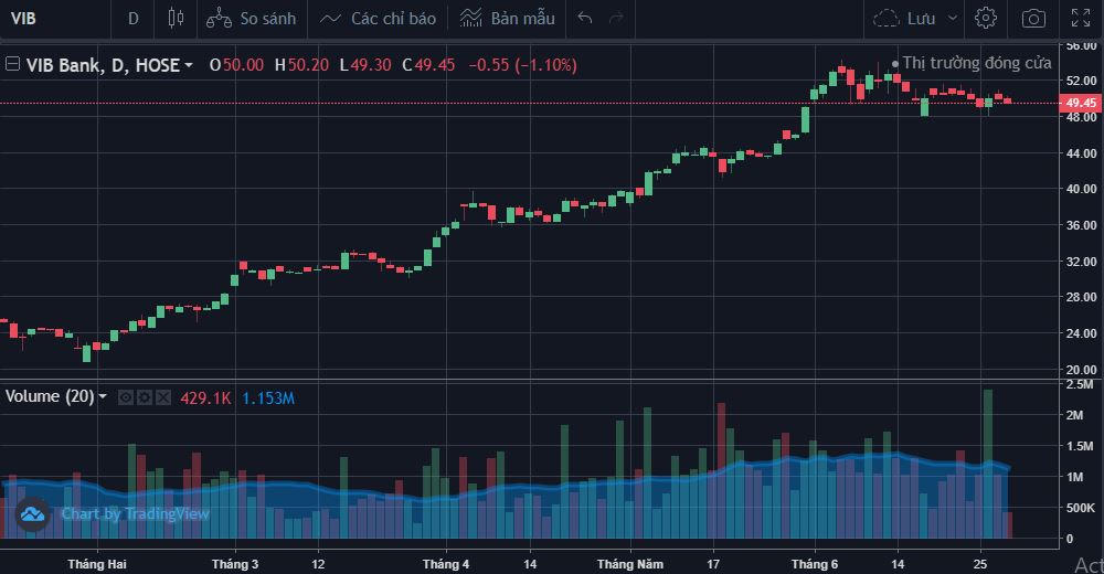 Cổ phiếu VIB đã trải qua giai đoạn tăng giá mạnh mẽ từ tháng 2 tới đầu tháng 6, trong thời gian 5 tháng này, thị giá cổ phiếu VIB đã tăng lên gấp 2,4 lần. Tuy nhiên, từ đầu tháng 6/2021, thị giá cổ phiếu VIB đã giảm khá mạnh từ 72.000 đồng/cp (2/6) xuống 49.450 đồng/cp (30/6), tương đương giảm 31%.