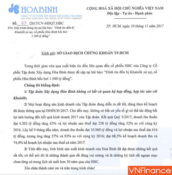 - Ngày 10/11 vừa qua, CTCP Tập đoàn xây dựng Hòa Bình đã có công văn số 47/2017/CV-HĐQT.BHC tiếp tục khẳng định không có hợp tác với Khaisilk. Tuy nhiên, giá cổ phiếu HBC vẫn giảm mạnh và Công ty Khaisilk vẫn "im lặng" trước những tin đồn liên quan đến Tập đoàn Xây dựng Hòa Bình.