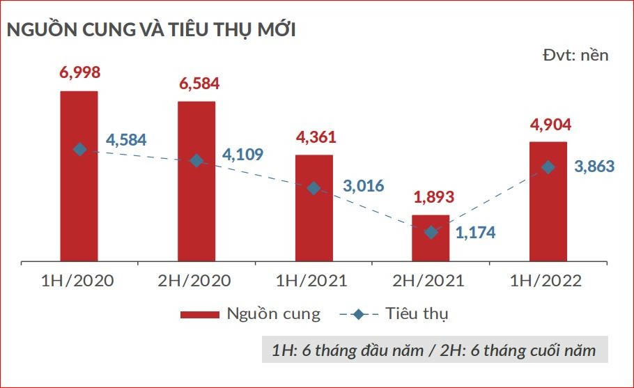 Lượng tiêu thụ đạt 3.863 nền, tương đương 79% tổng nguồn cung mới, tăng khoảng 28% svck năm 2021 (3.016 nền), tăng hơn 27% so với 2 quý trước đó.