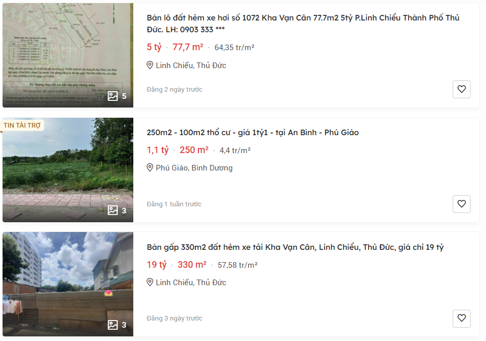 Đơn cử như lô đất 330m2 thuộc đất hẻm xe tải Kha Vạn Cân đang được rao bán với mức giá 57,58 triệu/m2 tương ứng với giá là 19 tỷ đồng. Hay như lô đất hẻm xe hơi số 1072 Kha Vặn Cân chỉ rộng 77,7m2 đang được rao bán với giá 5 tỷ, tương đương với 64,35 triệu/m2.
