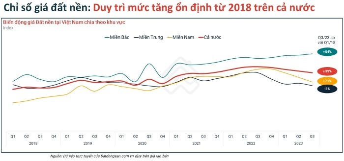 Dữ liệu của Batdongsan.com.vn cho thấy, chỉ số giá đất nền vẫn duy trì mức tăng ổn định từ năm 2018 đến nay trên phạm vi cả nước. Trong vòng 5 năm qua, mức độ tăng giá trung bình của đất nền miền Nam cao hơn miền Bắc. Từ quý I/2018 đến quý I/2023, giá rao bán đất nền miền Nam đã tăng 71%, trong khi miền Bắc tăng 54%.