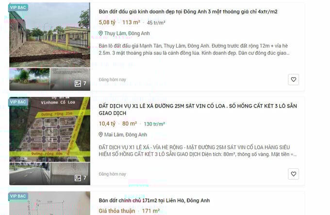 Trên trang Batdongsan.com, hiện giá đất Đông Anh năm 2024 tại một số xã đã tăng mạnh so với năm 2023. Cụ thể, tại xã Tiên Dương (huyện Đông Anh), những nơi có vị trí ngõ rộng, mức giá rao bán đang từ 60-85 triệu đồng/m2, tăng khoảng 20% so với mức giá tại thời điểm tháng 12/2023 (50-70 triệu đồng/m2).
