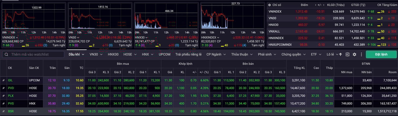 Ngay từ đầu phiên, áp lực bán đã lan rộng khiến phần lớn cổ phiếu trên thị trường giảm điểm. Trong bối cảnh đó, nhóm cổ phiếu dầu khí trở thành điểm sáng hiếm hoi giữa "biển lửa". Các mã OIL, PVD, PLX, PVS, BSR… đồng loạt tăng mạnh, dao động từ 4% đến gần 8%. Không chỉ tăng giá, thanh khoản của nhóm này cũng bật lên vượt xa mức trung bình 50 phiên gần nhất, phản ánh dòng tiền lớn đang chủ động tìm đến cổ phiếu dầu khí như một kênh trú ẩn ngắn hạn.