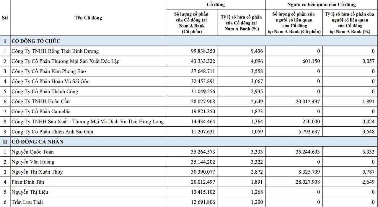 Danh sách doanh nghiệp nắm trên 1% cổ phần Nam A Bank còn những cái tên như Công ty CP Thương mại Sản xuất Độc Lập nắm 4,096% vốn, Công ty CP Kim Phong Bảo sở hữu 3,56% vốn; Công ty CP Thành Công sở hữu 2,9% vốn.