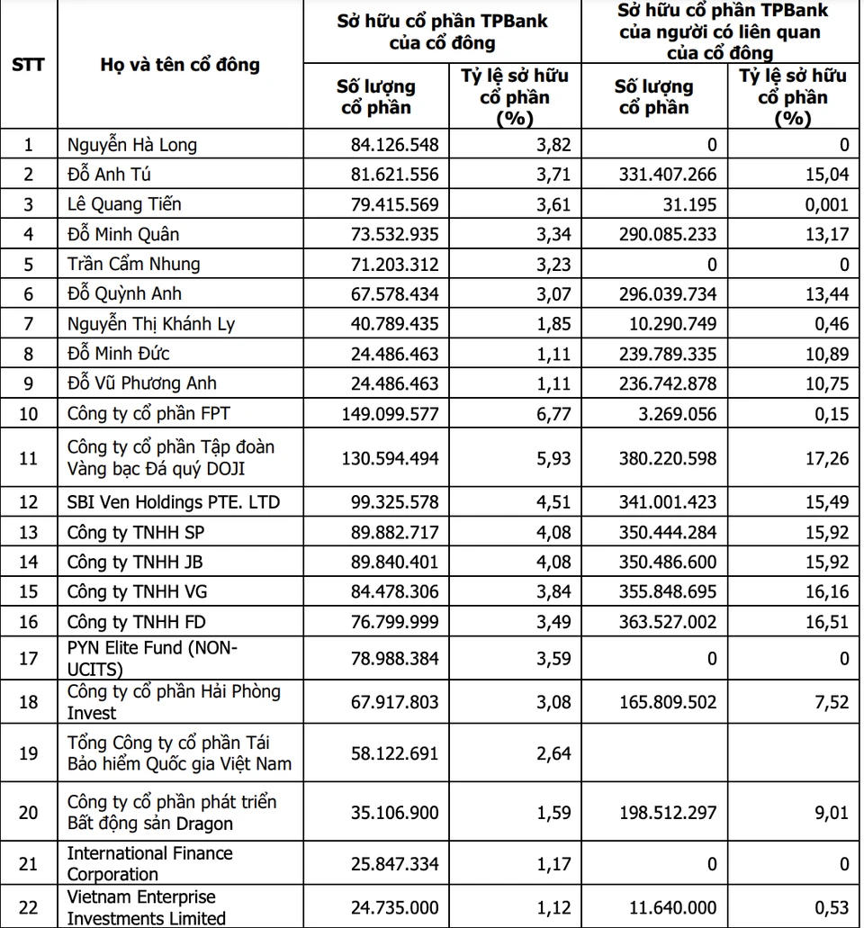 Theo đó, có 22 cổ đông (nắm trên 1% vốn điều lệ TPBank) sở hữu tổng cộng hơn 70% vốn TPBank, gồm 13 tổ chức và 9 cá nhân.