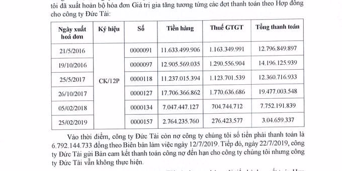 Ngày 15/6/2019, các hạng mục công trình do Công ty Công Kin thi công theo Hợp đồng đã được Công ty Đức Tài nghiệm thu hoàn thành, đưa vào sử dụng. Công ty Công Kin cũng đã xuất toàn bộ hóa đơn thuế GTGT theo Hơp đồng cho Công ty Đức Tài. Theo Biên bản làm việc ngày 12/7/2019, Công ty Đức Tài còn nợ Công ty Công Kin số tiền 6.792.144.733 đồng.