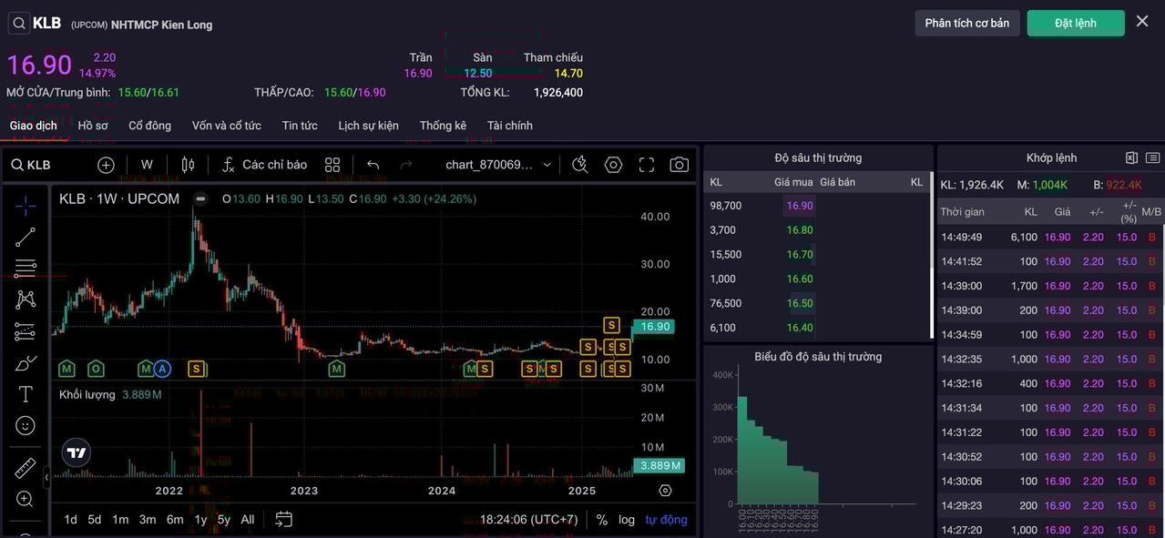 So với vùng đáy 9.500 đồng/cổ phiếu ghi nhận cách đây một tháng, cổ phiếu này đã tăng gần 80%, đồng thời vượt đỉnh năm 2023. Tính theo mức giá hiện tại, vốn hóa thị trường của KienlongBank đã vượt ngưỡng 6.100 tỷ đồng.
