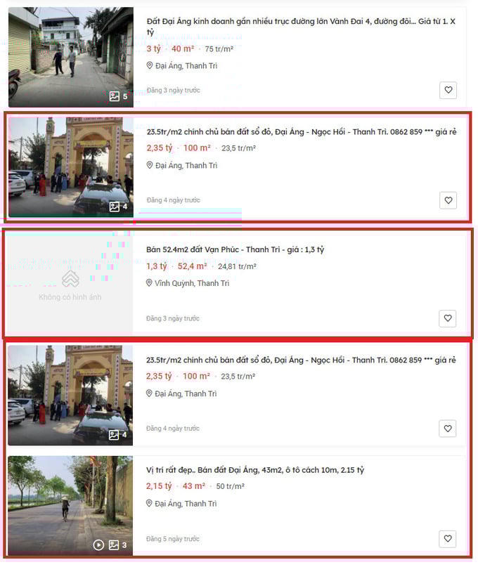 Theo khảo sát ở một số trang rao bán bất động sản, giá đất nền các xã Đại Áng, Vĩnh Quỳnh, Ngọc Hồi, Liên Ninh... chỉ từ 30-40 triệu đồng/m2. Vài lô diện tích nhỏ ngay chợ Đám (xã Đại Áng, Thanh Trì) chỉ cách trục chính đường Đại Áng 100m vẫn có mức giá chỉ từ 25triệu đồng/m2.