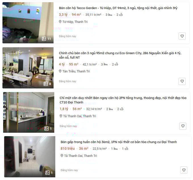 Một số căn có diện tích nhỏ ở chung cư Đại Thanh cũng đang được rao bán với mức giá hơn 800 triệu đồng cho căn 36m2, tương ứng 22,5 triệu đồng/m2; căn rộng hơn là 56m2 được rao bán với giá 1,8 tỷ đồng tương ứng với 32,14 triệu đồng/m2.