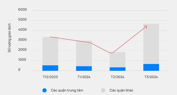 Số lượng giao dịch tại nhóm quận này tăng 176% so với tháng 2/2024. Giao dịch tại các quận trung tâm cũng tăng gấp đôi so với tháng 2/2024, tập trung tại các quận Hai Bà Trưng, Ba Đình, Đống Đa.