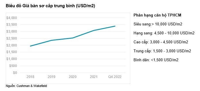 Trong báo cáo mới đây, Cushman & Wakefield cho biết, 3 tháng cuối năm, thị trường căn hộ TP.HCM ghi nhận giá bán sơ cấp đạt mức trung bình 3.400 USD một m2, tăng 21% so với quý trước.