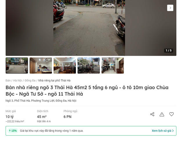 Trên nhiều hội, nhóm mạng xã hội, thông tin rao bán về những căn nhà trong ngõ cũng được đăng tải liên tục, giá chào bán cũng cao ngất ngưởng. Chẳng hạn, một căn nhà có diện tích 34m2 thuộc khu vực ngõ Gốc Đề, phường Minh Khai, quận Hai Bà Trưng cũng đang được chào bán với giá khoảng 160 triệu đồng/m2. Một căn nhà trong ngõ có diện tích 46m2 thuộc phố Thái Hà, quận Đống Đa cũng đang được chào bán với giá 290-314 triệu đồng/m2.
