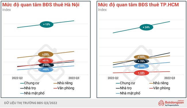 Loại hình bất động sản cho thuê dẫn đầu cả 2 thị trường Hà Nội và TP.HCM về mức độ quan tâm là chung cư. Cụ thể, nhu cầu tìm thuê chung cư Hà Nội trong quý III tăng khoảng 13% so với quý trước, còn mức tăng ở TP.HCM là 24%.