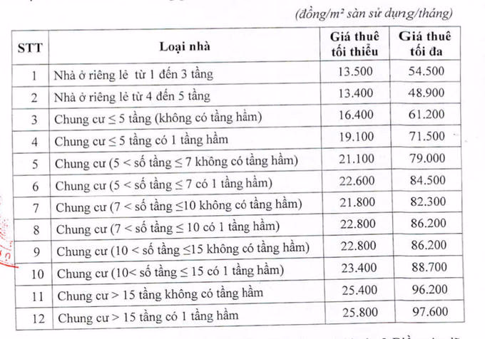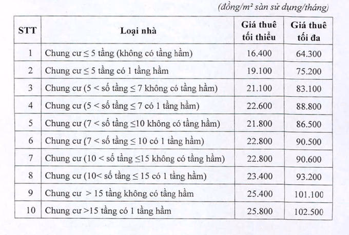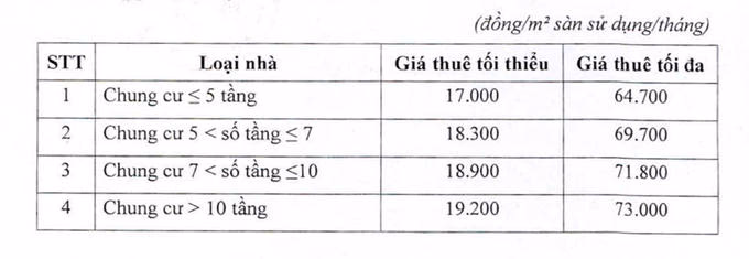 Theo đó, giá thuê nhà ở xã hội được đầu tư xây dựng không phải bằng vốn đầu tư công, nguồn tài chính công đoàn, do chủ đầu tư thoả thuận với bên thuê theo khung giá dưới đây: