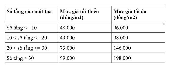 Trong đó, mức giá thuê cao nhất áp dụng cho tòa nhà cao từ 30 tầng trở lên với giá thuê 198.000 đồng/m2/tháng. Mức giá thuê thấp nhất áp dụng cho tòa nhà dưới 10 tầng với giá thuê 48.000 đồng/m2/tháng.