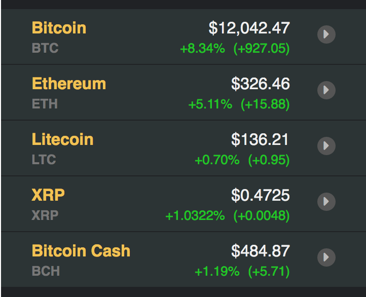 Giá Bitcoin (BTC) tăng 927,05 USD (tương đương 8,34%) lên mức 12.042,47 USD.