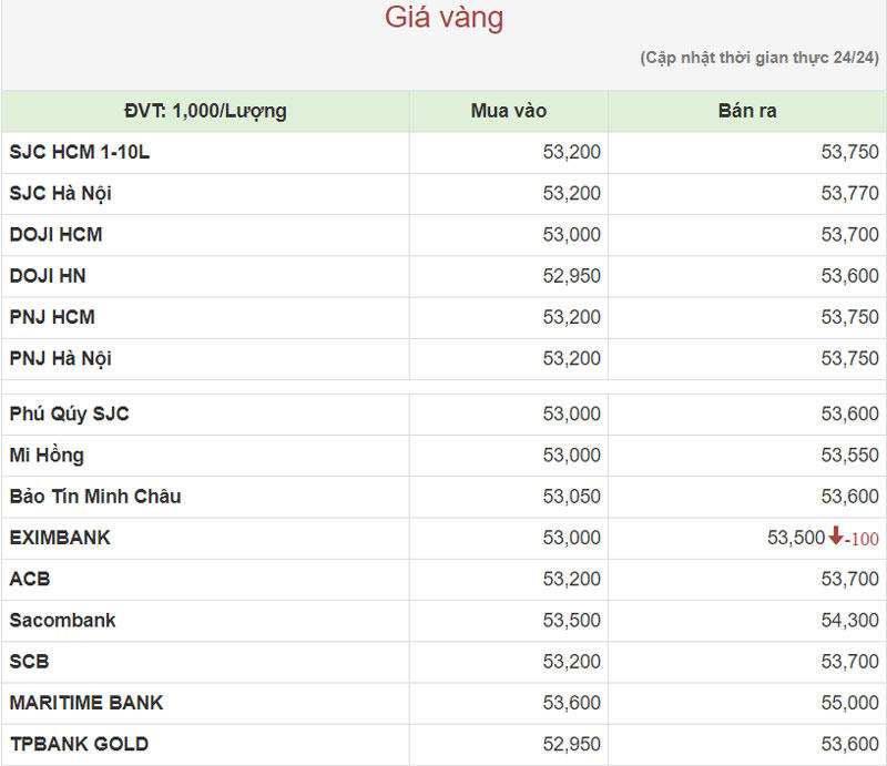 Hiện công ty Vàng bạc đá quý Sài Gòn (SJC) niêm yết giá vàng miếng mua vào ở mức 53 – 53,77 triệu đồng/lượng (mua vào-bán ra).