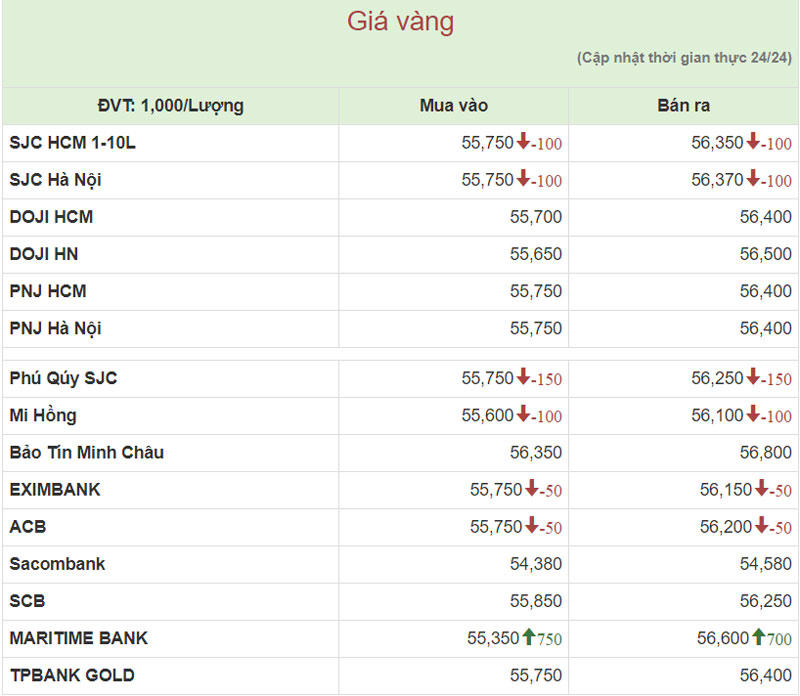 Hiện công ty Vàng bạc đá quý Sài Gòn (SJC) niêm yết giá vàng miếng mua vào ở mức 55,75 – 56,37 triệu đồng/lượng (mua vào-bán ra).