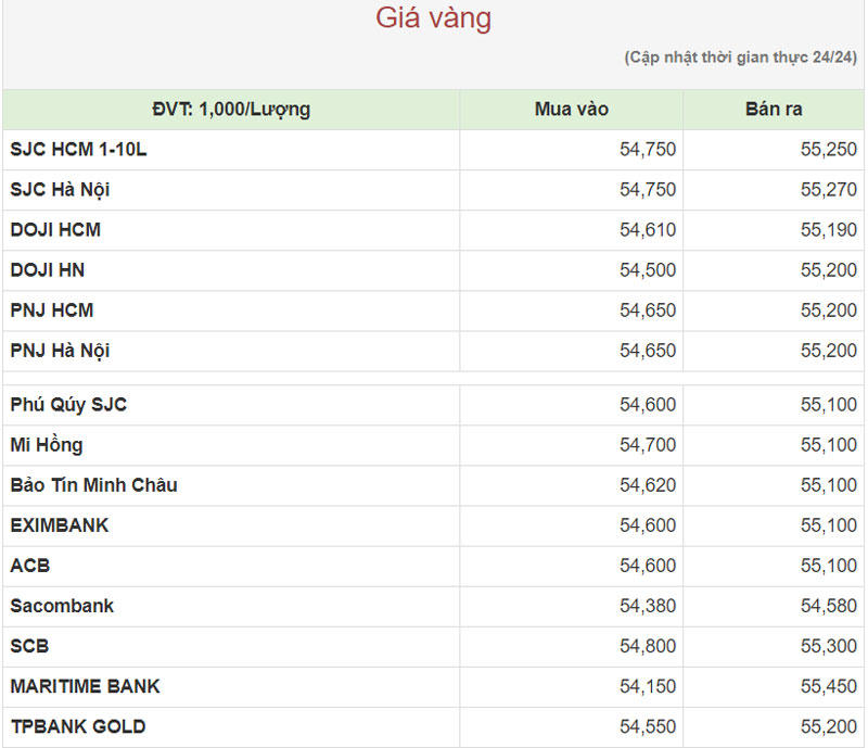 Hiện công ty Vàng bạc đá quý Sài Gòn (SJC) niêm yết giá vàng miếng mua vào ở mức 54,45 – 55,27 triệu đồng/lượng (mua vào-bán ra).