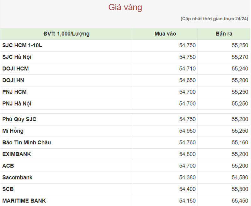 Hiện công ty Vàng bạc đá quý Sài Gòn (SJC) niêm yết giá vàng miếng mua vào ở mức 54,75 – 55,27 triệu đồng/lượng (mua vào-bán ra).