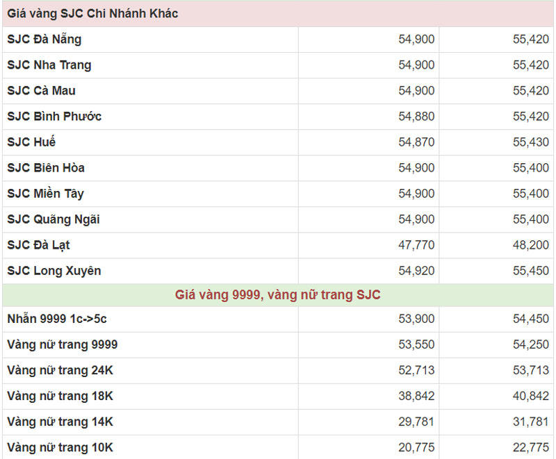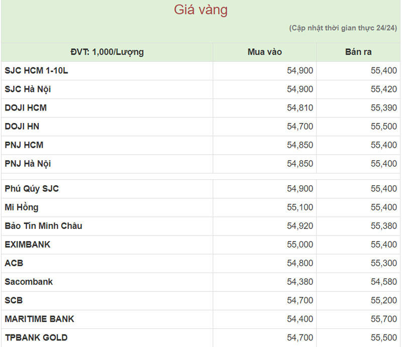 Hiện công ty Vàng bạc đá quý Sài Gòn (SJC) niêm yết giá vàng miếng mua vào ở mức 54,9 – 55,42 triệu đồng/lượng (mua vào-bán ra).