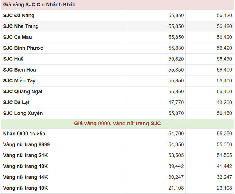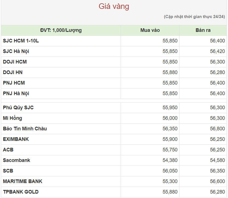 Hiện công ty Vàng bạc đá quý Sài Gòn (SJC) niêm yết giá vàng miếng mua vào ở mức 55,85 – 56,42 triệu đồng/lượng (mua vào-bán ra).