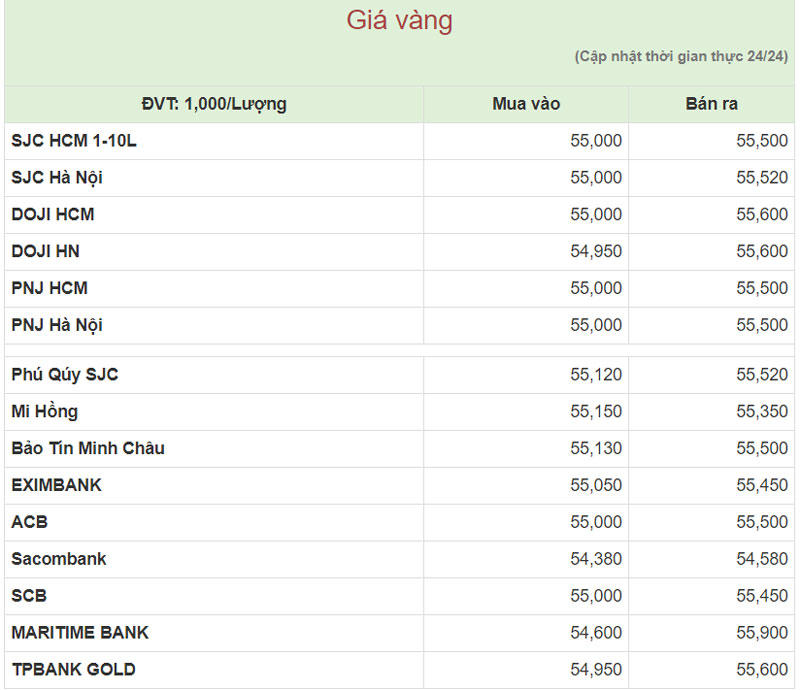 Hiện công ty Vàng bạc đá quý Sài Gòn (SJC) niêm yết giá vàng miếng mua vào ở mức 55 – 55,52 triệu đồng/lượng (mua vào-bán ra).