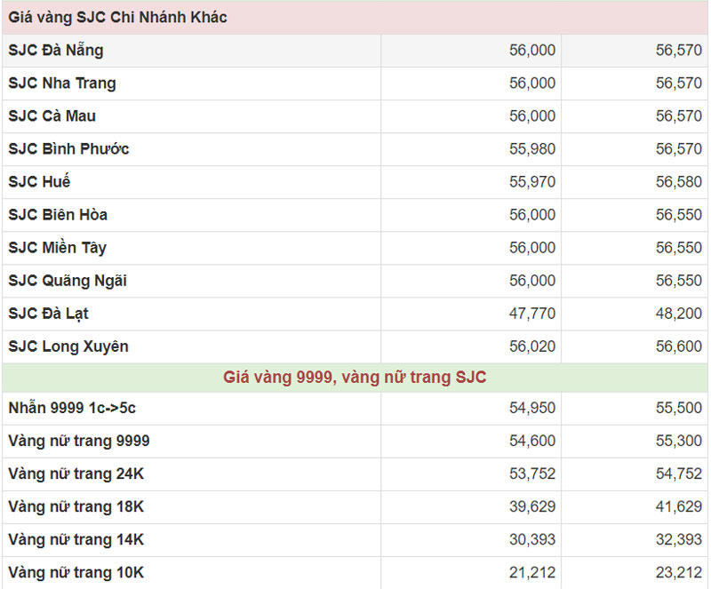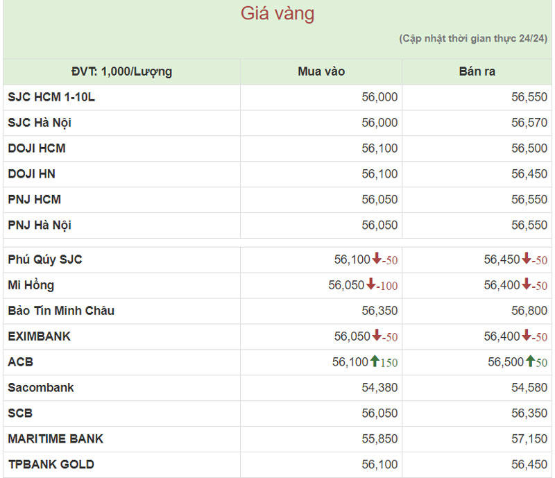 Hiện công ty Vàng bạc đá quý Sài Gòn (SJC) niêm yết giá vàng miếng mua vào ở mức 56 – 56,57 triệu đồng/lượng (mua vào-bán ra).