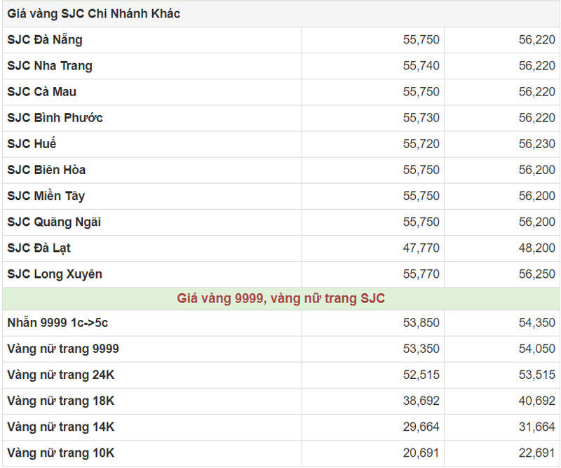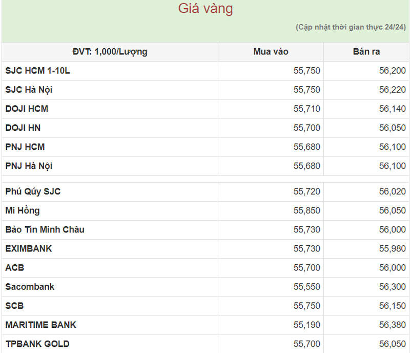 Công ty Vàng bạc đá quý Sài Gòn (SJC) niêm yết giá vàng miếng mua vào ở mức 55,75 - 56,22 triệu đồng/lượng (mua vào-bán ra).