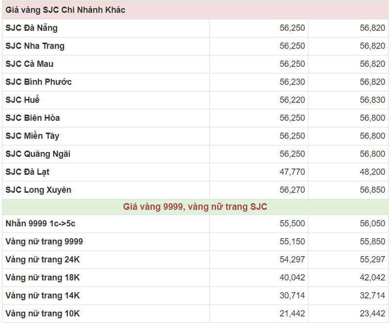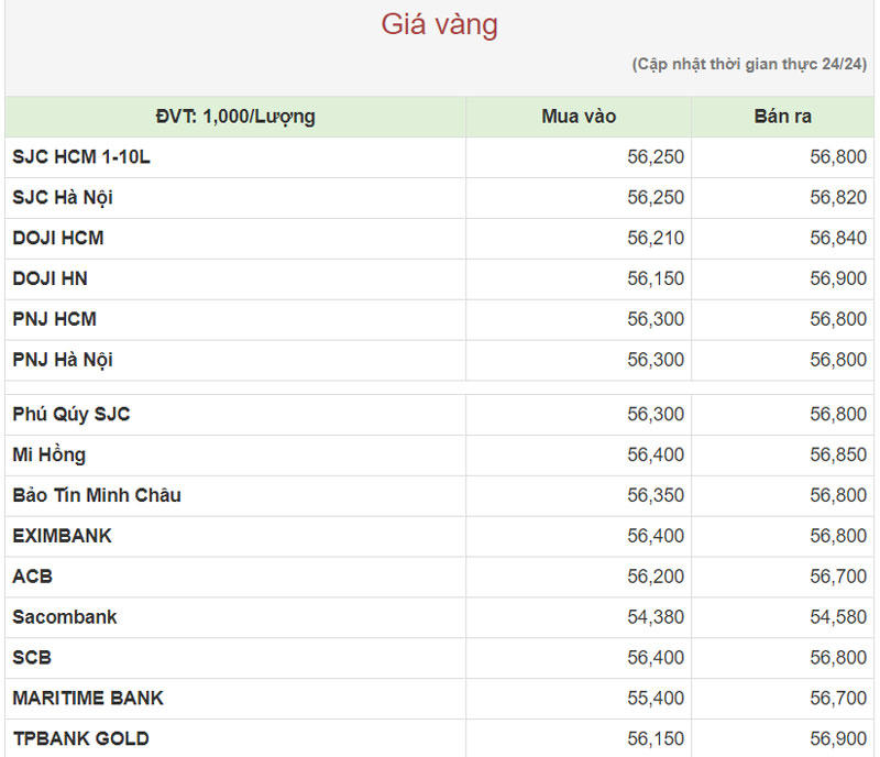 Hiện công ty Vàng bạc đá quý Sài Gòn (SJC) niêm yết giá vàng miếng mua vào ở mức 56,25 – 56,82 triệu đồng/lượng (mua vào-bán ra).