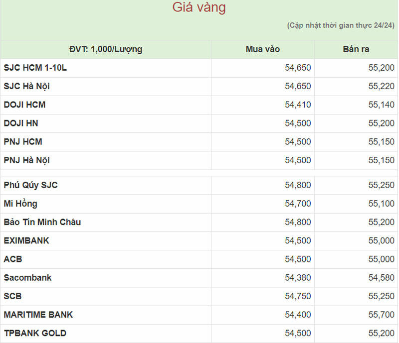 Hiện công ty Vàng bạc đá quý Sài Gòn (SJC) niêm yết giá vàng miếng mua vào ở mức 54,65 – 55,22 triệu đồng/lượng (mua vào-bán ra).