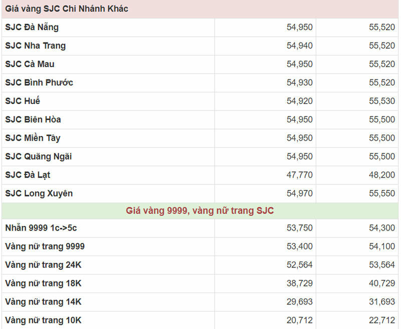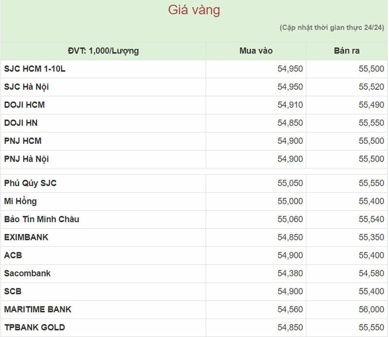 Hiện công ty Vàng bạc đá quý Sài Gòn (SJC) niêm yết giá vàng miếng mua vào ở mức 54,95 – 55,52 triệu đồng/lượng (mua vào-bán ra).