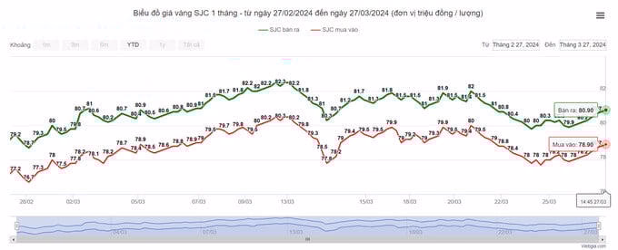 Chiều 27/3, giá vàng 9999 của SJC vọt hơn nửa triệu đồng trong đầu giờ sáng, lên mức 80,9 triệu đồng/lượng (chiều bán).