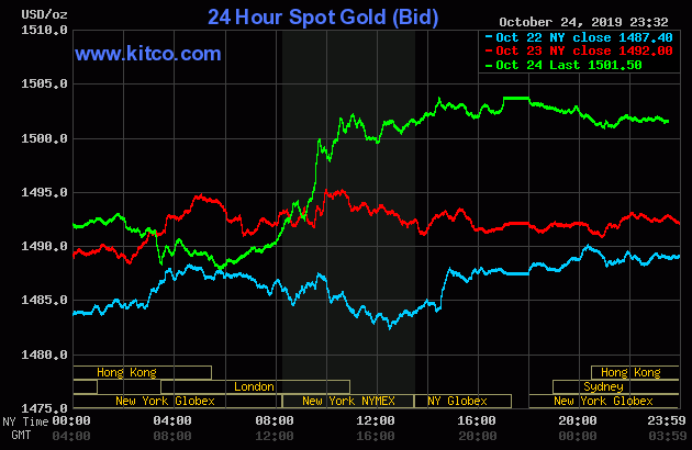 Cùng thời điểm, giá vàng giao ngay trên sàn Kitco đang giao dịch ở mức 1.501,5 USD/ounce, tăng 9,5 USD/ounce, tương đương 0,64% so với chốt phiên trước.