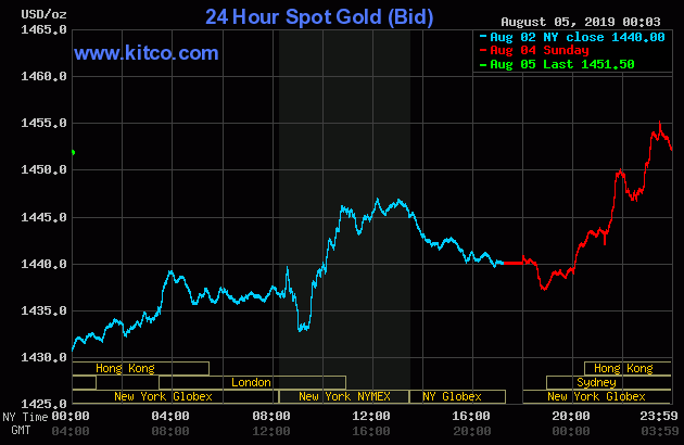 Cùng thời điểm, giá vàng giao ngay trên sàn Kitco đang giao dịch ở mức 1.451,5 USD/ounce, tăng 11,5 USD, tương đương 0,8% so với chốt phiên trước.