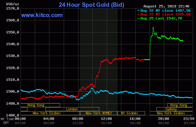 Cùng thời điểm, giá vàng giao ngay trên sàn Kitco đang giao dịch ở mức 1.541,7 USD/ounce, tăng tới 15,1 USD, tương đương 0,99% so với chốt phiên trước.