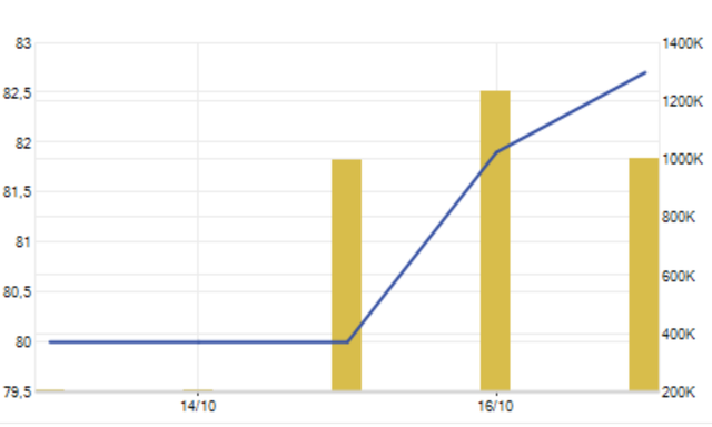 Khối lượng giao dịch ở mã này mặc dù giảm đáng kể so với phiên trước nhưng vẫn xấp xỉ 998 nghìn cổ phiếu, vượt trội so với mức bình quân hơn 400 nghìn cổ phiếu/phiên trong suốt 1 năm qua.