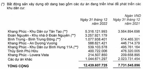Đơn cử, tại Nhà Khang Điền, các dự án đang ghi nhận tồn kho lớn của Khang Điền gồm: Khu dân cư Tân Tạo (5.316 tỉ đồng), Khu nhà ở Đoàn Nguyên (3.258 tỉ đồng), Bình Trưng Đông (1.078 tỉ đồng),... Tổng giá trị tồn kho tại cuối năm 2022 của Khang Điền đạt 12.440 tỉ đồng, cao gấp 1,6 lần đầu năm.