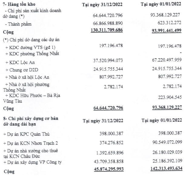 Hay như tại công ty CP Đầu tư phát triển đô thị Công Nghiệp số 2 (D2D), hàng tồn kho vẫn duy trì ở mức khủng 130 tỉ đồng, tăng hơn so với đầu kỳ 99 tỉ đồng. Trong đó, hàng tồn kho khu dân cư ở mức 64.6 tỉ đồng. Cụ thể, KDC Lộc An 37.5 tỉ đồng, chung cư D2D 24.9 tỉ đồng, còn 2 dự án NOXH tồn kho ít 808 triệu đồng ở dự án NOXH Lộc An, và 2.8 triệu tại NOXH phường Thống Nhất.
