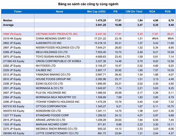 Nếu nhìn rộng ra hơn khi so sánh với các doanh nghiệp F&B trên thế giới, thống kê của Chứng khoán Bảo Việt (BVS) cho thấy, VNM có được tỷ suất sinh lời ROA và ROE ghi nhận trong năm 2022 lần lượt 26% và 17%, kết quả này vượt trội hơn rất nhiều đại gia F&B nổi tiếng như Meji (Nhật Bản), Morinaga (Nhật Bản), Lotte (Hàn Quốc), Otion (Hàn Quốc), Mengniu Dairy (Trung Quốc)…