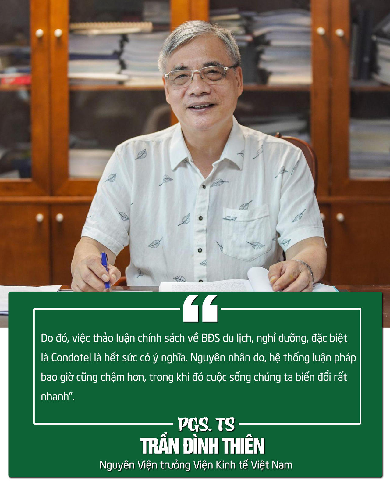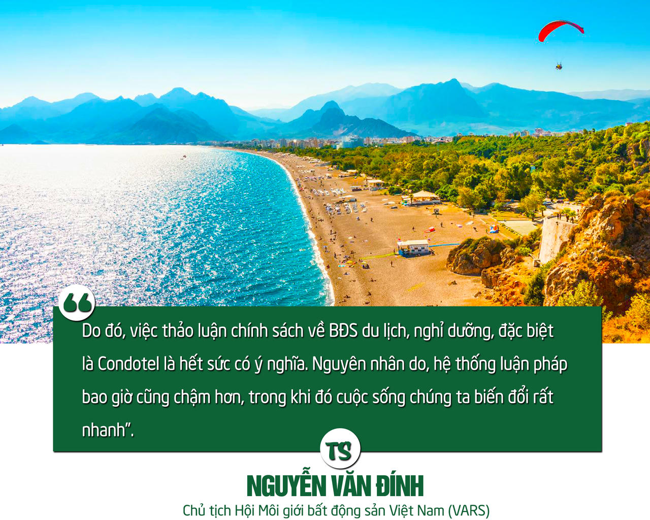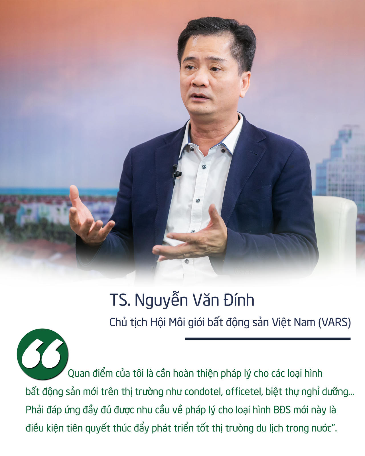 TS. Nguyễn Văn Đính, Chủ tịch Hội Môi giới bất động sản Việt Nam (VARS) nhận định, pháp lý rõ ràng là vấn đề mang tính then chốt đối với sự phát triển của thị trường BĐS nghỉ dưỡng. Việc BĐS nghỉ dưỡng không được quy định trong luật sẽ kéo lùi sự phát triển của hạ tầng ngành du lịch. Điều này đi ngược với chủ trương phát triển kinh tế xanh ở nước ta, lãng phí tiềm năng dồi dào của du lịch. Cơ sở lưu trú thiếu thốn, yếu kém, thì tiềm năng du lịch tốt mấy cũng khó phát triển.