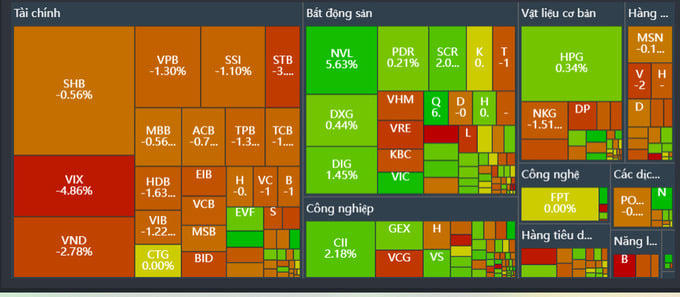 toàn sàn có 189 mã giảm so với 133 mã tăng và 58 mã đứng giá. Áp lực bán xuất hiện nhiều ở nhóm tài chính - ngân hàng, khi hàng loạt cổ phiếu lớn như VPB (-1,30%), SSI (-1,10%), STB (-3,00%), VIX (-4,86%) hay VND (-2,78%) đồng loạt lùi bước. Đây là nguyên nhân chính khiến thị trường chung khó giữ nhịp tăng. Trong rổ VN30, nhiều mã ngân hàng cũng chìm trong sắc đỏ như BID (-2,45%), HDB (-1,63%), MBB (-0,56%), CTG (-0,00% nhưng biến động mạnh trong phiên).