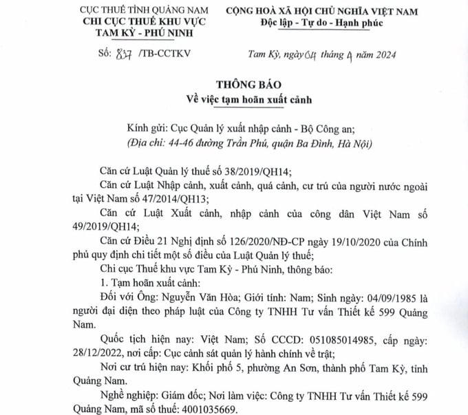 Cụ thể, Chi Cục Thuế khu vực Tam Kỳ - Phú Ninh thuộc Cục Thuế tỉnh Quảng Nam vừa có thông báo số 837/TB-CCTKV gửi Cục Quản lý xuất nhập cảnh – Bộ Công an, về việc tạm hoãn xuất cảnh đối với ông Nguyễn Văn Hòa là người đại diện theo pháp luật kiêm giám đốc của Công ty TNHH Tư vấn Thiết Kế 599 Quảng Nam (gọi tắt là Công ty 599 Quảng Nam), nơi cư trú tại Khu phố 5, phường An Sơn, Tp.Tam Kỳ, tỉnh Quảng Nam.