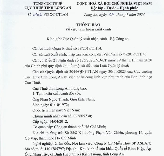 Ngày 8/7, Cục Thuế tỉnh Long An đã công bố thông tin về thông báo số 4162/TBXC-CTLAN gửi Cục Quản lý xuất nhập cảnh – Bộ Công an về việc tạm hoãn xuất cảnh đối với ông Phan Ngọc Thanh, địa chỉ thường trú tại đường Phạm Văn Chiêu, Phường 14, quận Gò Vấp, Tp.HCM.