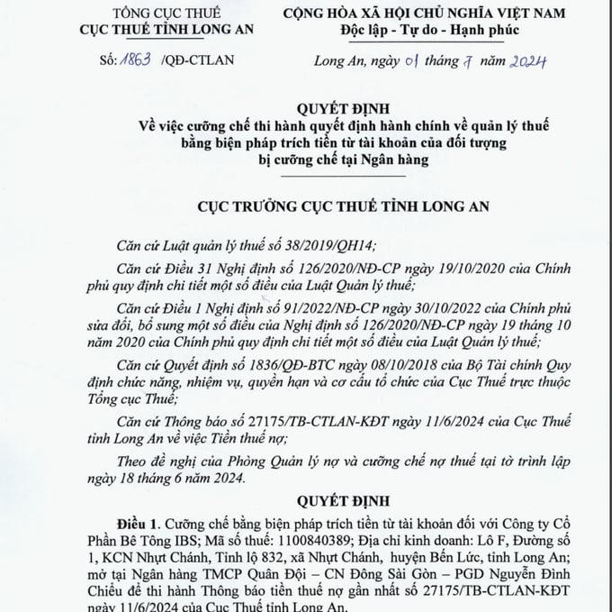 Đồng thời, liên quan đến việc áp dụng các biện pháp cưỡng chế để thu hồi tiền nợ thuế từ doanh nghiệp trên địa bàn, ngày 1/7, Cục Thuế tỉnh Long An đã ban hành Quyết định số 1863/QĐ-CTLAN về việc cưỡng chế bằng biện pháp trích tiền từ tài khoản đối với Công ty Cổ Phần Bê Tông IBS, mã số thuế: 1100840389, địa chỉ kinh doanh tại Lô F, Đường số 1, KCN Nhựt Chánh, Tỉnh lộ 832, xã Nhựt Chánh, huyện Bến Lức, tỉnh Long An. Tài khoản mở tại Ngân hàng TMCP Quân Đội – CN Đông Sài Gòn – PGD Nguyễn Đình Chiểu để thi hành Thông báo tiền thuế nợ gần nhất số 27175/TB-CTLAN-KĐT ngày 11/6/2024 của Cục Thuế tỉnh Long An.