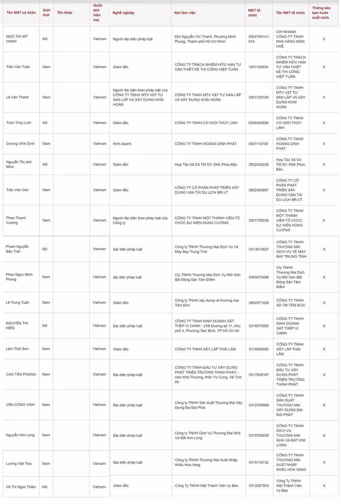 Cục Thuế vừa công khai hàng loạt người nộp thuế là giám đốc, đại diện pháp luật các doanh nghiệp như Công ty Xây lắp Thái Sơn, chi nhánh Công ty TNHH nhà hàng Món Huế,...bị áp dụng biện pháp tạm hoãn xuất cảnh do còn nợ thuế.