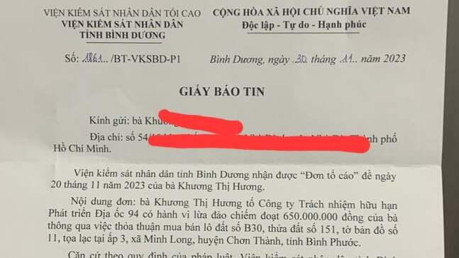 Cụ thể, theo bà K.T.H (ngụ Tp.Thủ Dầu Một, Bình Dương), vào đầu năm 2021, qua giới thiệu bà đã trực tiếp làm việc với đại điện Công ty TNHH Phát triển Địa ốc 94 để mua đất nền.