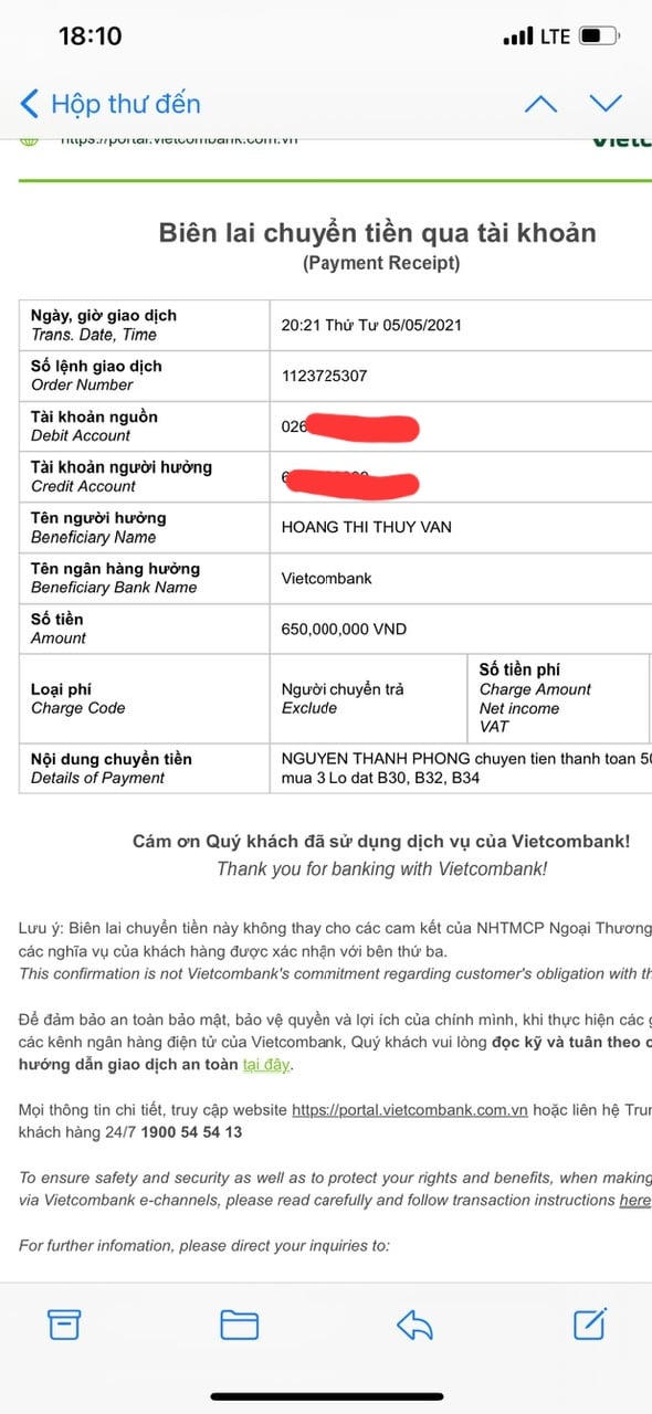 Ngày 05/05/2021, chồng bà H. ông Nguyễn Thanh P. sử dụng số tài khoản cá nhân chuyển khoản số tiền 650 triệu đồng vào chủ tài khoản đứng tên bà Hoàng Thị Thùy Vân theo hướng dẫn của ông Lê Minh Nhơn “chuyển khoản cho Kế toán của Công ty TNHH Phát Triển Địa Ốc 94 để thực hiện việc thanh toán đợt 1”.